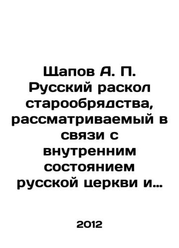"Shchapov A. P. Russian schism of the Old Believer considered in connection with the internal state of the Russian Church and civics in the seventeenth century and the first half of the eighteenth century; Land and schism In Russian (ask us if in doubt)/Shchapov A. P. Russkiy raskol staroobryadstva rassmatrivaemyy v svyazi s vnutrennim sostoyaniem russkoy tserkvi i grazhdanstvennosti v XVII veke i v pervoy polovine XVIII; Zemstvo i raskol. Tyre Room 5 Moscow Publishing House V. Sekachev 2012 712s. SKUalb4d7f38a473b733c4."