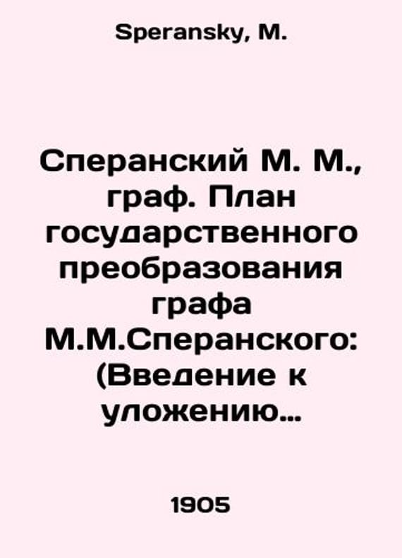M. M. Speransky, Count. Plan of state transformation of Count M. M. Speransky: (Introduction to the state laws of 1809) In Russian /Speranskiy M. M., graf. Plan gosudarstvennogo preobrazovaniya grafa M.M.Speranskogo: (Vvedenie k ulozheniyu gosudarstvennykh zakonov 1809 g.) M Edition of Russian Thought 1905. 359 p. We have thousands of titles and often several copies of each title may be available. Please feel free to contact us for a detailed description of the copies available. SKUalb4e67d2a19809d31b.