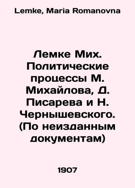 Lemke Mikh. Political processes of M. Mikhailov, D. Pisarev and N. Chernyshevsky. (According to unpublished documents) In Russian /Lemke Mikh. Politicheskie protsessy M. Mikhaylova, D. Pisareva i N. Chernyshevskogo. (Po neizdannym dokumentam) With portraits and illustrations (without a portrait of Chernyshevsky), St. Petersburg Publishing House O. N. Popova, 1907, 421 p. We have thousands of titles and often several copies of each title may be available. Please feel free to contact us for a detailed description of the copies available. SKUalb525e880a36736fe7.
