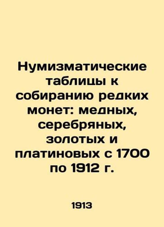 Numismatic tables for the collection of rare coins: copper silver gold and platinum from 1700 to 1912 /Numizmaticheskie tablitsy k sobiraniyu redkikh monet: mednykh serebryanykh zolotykh i platinovykh s 1700 po 1912 g. Editions IV. St. Petersburg. Printing House of the Staff of the Guard Corps. 1913. 12 Leningrad We have thousands of titles and often several copies of each title may be available. Please feel free to contact us for a detailed description of the copies available. SKUalb5270e7792f1a8679