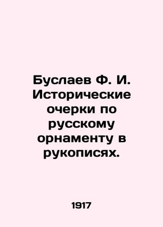 Short description: Buslayev F. I. Historical sketches on Russian ornaments in manuscripts. In Russian /Buslaev F. I. Istoricheskie ocherki po russkomu ornamentu v rukopisyakh.In Russian.5 copy Moscow Publishing House, V. Sekachev, 2015, 220s. We have thousands of titles and often several copies of each title may be available. Please feel free to contact us for a detailed description of the copies available. SKUalb7519c79e754183d8