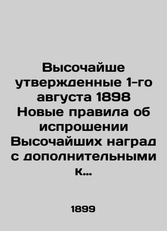 The New Rules on the Request of the Highest Decorations approved on August 1 1898 with additional provisions to these rules. In Russian (ask us if in doubt)/Vysochayshe utverzhdennye 1-go avgusta 1898 Novye pravila ob isproshenii Vysochayshikh nagrad s dopolnitelnymi k etim pravilam uzakoneniyami.Second C-Petersburg Printing House of M.Merkushev 1899. 40 p.. SKUalb5638009c4c3d55a2.
