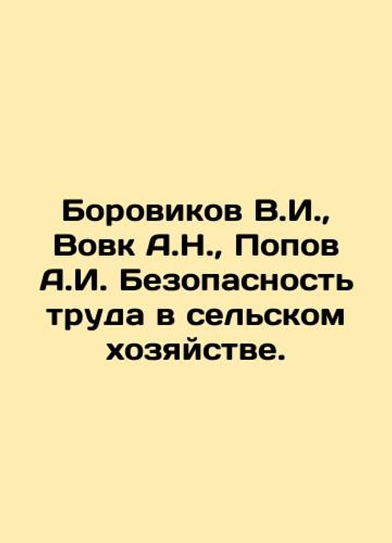 Borovikov V.I., Vovk A.N., Popov A.I. Labor safety in agriculture. In Russian /Borovikov V.I., Vovk A.N., Popov A.I. Bezopasnost truda v selskom khozyaystve. Borovikov V.I., Vovk A.N., Popov A.I. Labor safety in agriculture. We have thousands of titles and often several copies of each title may be available. Please feel free to contact us for a detailed description of the copies available. SKUalb5a3a1a09b493b62c.