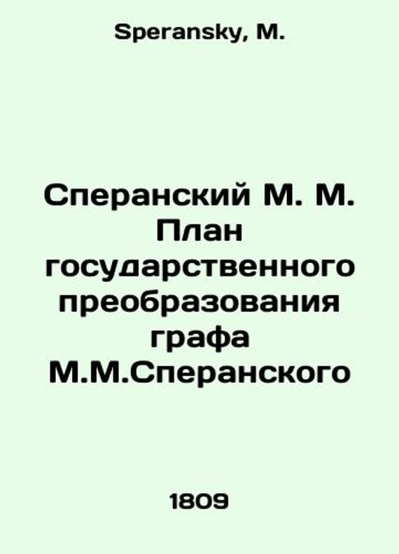 Speransky M. M. State Transformation Plan for Count M.M. Speransky In Russian /Speranskiy M. M. Plan gosudarstvennogo preobrazovaniya grafa M.M.Speranskogo An introduction to the laying down of state laws in 1809, Moscow Edition of Russian Thought 1905, 359c. We have thousands of titles and often several copies of each title may be available. Please feel free to contact us for a detailed description of the copies available. SKUalb5a4813e73e6bafe2.