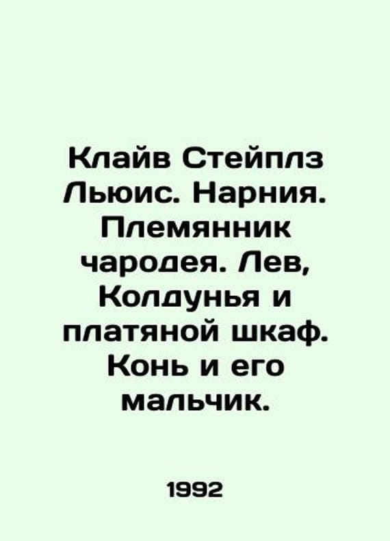 Clive Staples Lewis. Narnia. The nephew of a sorcerer. Lion, Witch and Wardrobe. Horse and his boy. In Russian /Klayv Steyplz Lyuis. Narniya. Plemyannik charodeya. Lev, Koldunya i platyanoy shkaf. Kon i ego malchik. Illustrated Edition. Translation from English by L. Lyakhova. Illustrations by E.Samokhvalova. Izhevsk. RIO Quest. 1992. We have thousands of titles and often several copies of each title may be available. Please feel free to contact us for a detailed description of the copies available. SKUalb5a5413e234155d0d.