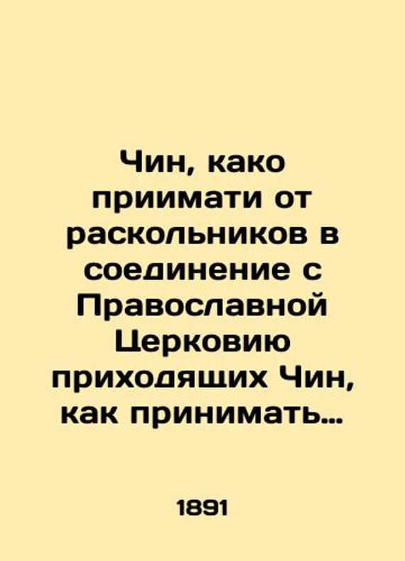 Rite, how to receive splitters into a union with the Orthodox Church of incoming Ranks, how to receive splitters into a union with the Orthodox Church of incoming Ranks. In Russian /Chin, kako priimati ot raskolnikov v soedinenie s Pravoslavnoy Tserkoviyu prikhodyashchikh Chin, kak prinimat raskolnikov, v soedinenie s pravoslavnoy tserkovyu prikhodyashchikh. With the blessing of His Holiness the Ruling Synod. In Old Slavonic. In the Synodal Printing House, 1891. 26, 2 p. We have thousands of titles and often several copies of each title may be available. Please feel free to contact us for a detailed description of the copies available. SKUalb5acac99ca536765c.