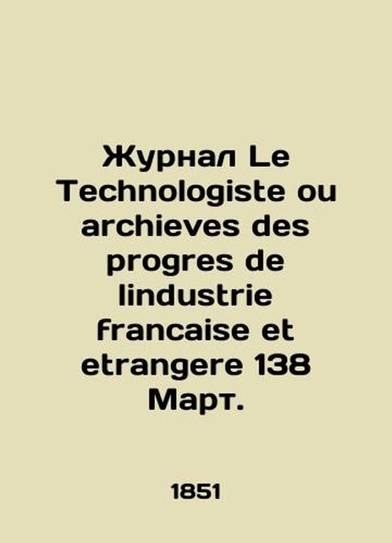 Le Technologiste ou archives des progres de lindustrie francaise et etrangere 214 July. In Russian /Zhurnal Le Technologiste ou archieves des progres de lindustrie francaise et etrangere 214 Iyul. Paris A la Librairie Encyclopedique de Roret 185745c. We have thousands of titles and often several copies of each title may be available. Please feel free to contact us for a detailed description of the copies available. SKUalb4a3571c3f5852c3c.