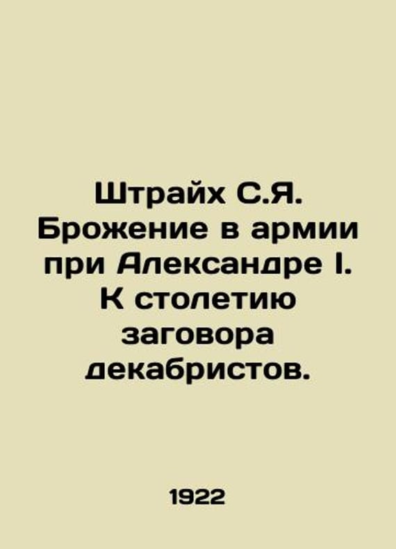 Streich S.J. ferment in the army under Alexander I. On the centenary of the Decembrist conspiracy. In Russian /Shtraykh S.Ya. Brozhenie v armii pri Aleksandre I. K stoletiyu zagovora dekabristov. St. Petersburg. 1922. We have thousands of titles and often several copies of each title may be available. Please feel free to contact us for a detailed description of the copies available. SKUalb5ae41a902ea04008.