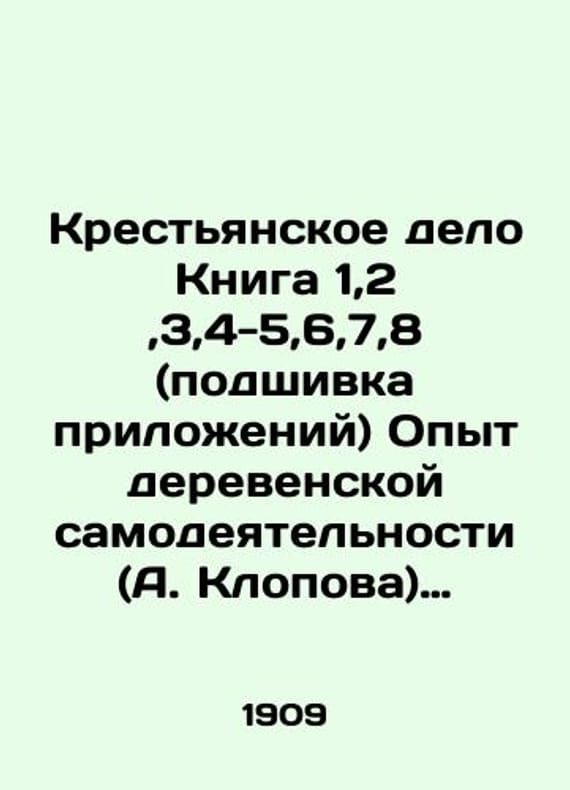 Peasant Affairs Book 1 2 3 4-5 6 7 8 (file) Experience of village amateur activities (A. Klopov) Proper care of bees (turf). On cultivation of fodder burrow in the middle Black Earth provinces (Sokovnini) In Russian (ask us if in doubt)/Krestyanskoe delo Kniga 1 2 3 4-5 6 7 8 (podshivka prilozheniy) Opyt derevenskoy samodeyatelnosti (A. Klopova) Pravilnyy ukhod za pchelami (dernova). O vozdelyvanii kormovogo buraka v srednikh chernozemnykh guberniyakh (Sokovnini)About Bacteria (Skalozhob) kn2-tape crops as a means of combating infertility and drought (gracians) About fish farming by rural owners (Borodina) What material should be used to build the roofs and walls of peasant estates (Tikhomirov) St. Petersburg Rural Gazette of 1909 Book 3 Rules of fruit sorting and packaging / trips of peasant walkers to Zhytomyr county Volyn province for familiarization with farm and bran farming / Educational about the importance of educational trips for peasant youth / Improvement of meadows their care and fertilization / Tobacco cultivation / kn 4-5-Koza / Artonomy in Denmark / trips of peasant walkers to the Mohyl province etc / Book 6 How peasants should increase their land ownership with the help of peasant We have thousands of titles and often several copies of each title may be available. Please feel free to contact us for a detailed description of the copies available. SKUalb5d30dde9d7e48cc2