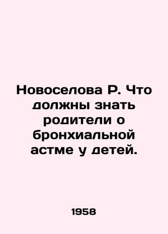 Novoselova R. What parents should know about bronchial asthma in children. In Russian /Novoselova R. Chto dolzhny znat roditeli o bronkhialnoy astme u detey. Advice to Medgizs Parents, 1958. 24 p. We have thousands of titles and often several copies of each title may be available. Please feel free to contact us for a detailed description of the copies available. SKUalb5e08ea2086e00699.