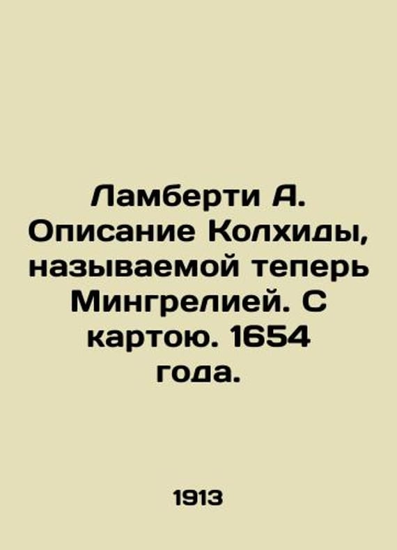 Lamberti A. Description of the Colchida, now called Mingrelia. With a map. 1654. In Russian /Lamberti A. Opisanie Kolkhidy, nazyvaemoy teper Mingreliey. S kartoyu. 1654 goda. Translation from the Italian C.F.G. Tiflis. Typography by K.P.Kozlovsky. 1913. 4, IV, 232 p., 1 l. Map, -25x16 sm. We have thousands of titles and often several copies of each title may be available. Please feel free to contact us for a detailed description of the copies available. SKUalb5ed84f621d9692cb.