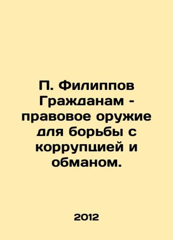 P. Filippov to Citizens: a legal weapon against corruption and deception. In Russian /P. Filippov Grazhdanam pravovoe oruzhie dlya borby s korruptsiey i obmanom. St. Petersburg Norm 2012. 32 p. We have thousands of titles and often several copies of each title may be available. Please feel free to contact us for a detailed description of the copies available. SKUalb600a543201b07e0f.