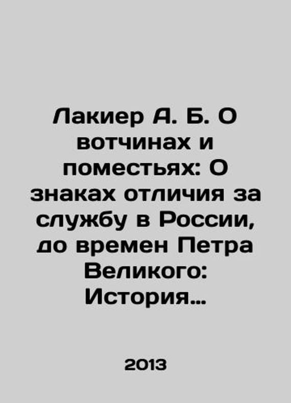 Lakier A. B. On Fiefdoms and Manors: On the Badges of Distinction for Service in Russia, Up to the Time of Peter the Great: The History of the Title of Sovereignty in Russia (collection of 3 books) In Russian /Lakier A. B. O votchinakh i pomestyakh: O znakakh otlichiya za sluzhbu v Rossii, do vremen Petra Velikogo: Istoriya titula gosudarey Rossii (sbornik 3 knig) Model 5 Moscow Publishing House, V. Sekachev, 2013, 338p. We have thousands of titles and often several copies of each title may be available. Please feel free to contact us for a detailed description of the copies available. SKUalb61c075b79c64ecbd.