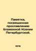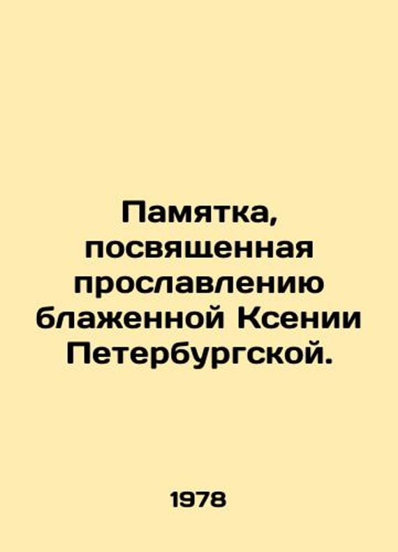 Memo dedicated to the glorification of Blessed Ksenia of St. Petersburg. In Russian /Pamyatka, posvyashchennaya proslavleniyu blazhennoy Ksenii Peterburgskoy. New York, USA Edition of the Foundation for Memory of the Blessed Ksenia of St. Petersburg. 1978. 88 p. We have thousands of titles and often several copies of each title may be available. Please feel free to contact us for a detailed description of the copies available. SKUalb635b2cd25d26023d.