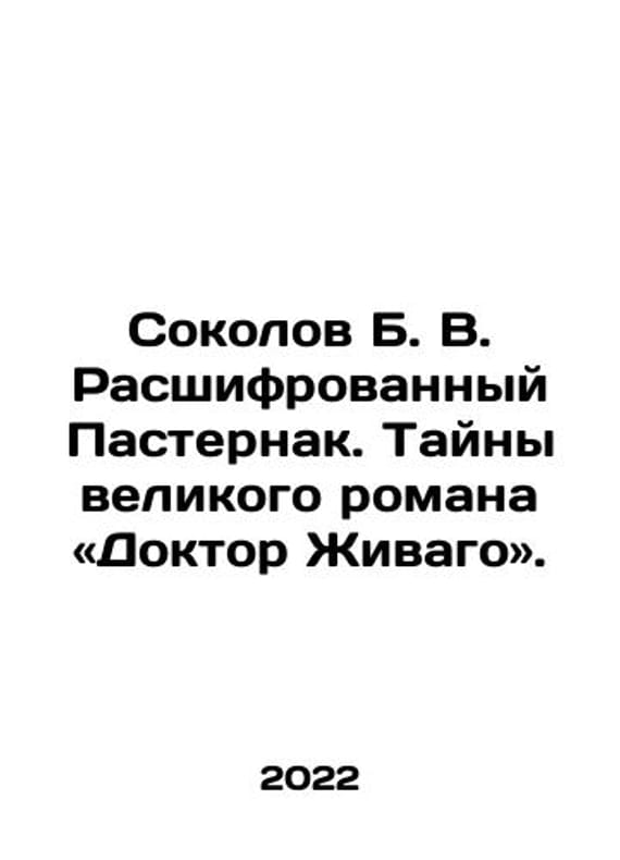 Sokolov B. V. Decoded Pasternak: The Mysteries of the Great Novel Doctor Zhivago. In Russian /Sokolov B. V. Rasshifrovannyy Pasternak. Tayny velikogo romana «Doktor Zhivago». M. Yauza-press 2022. 383 p. We have thousands of titles and often several copies of each title may be available. Please feel free to contact us for a detailed description of the copies available. SKUalb643e2c6dc6d0c1d5.