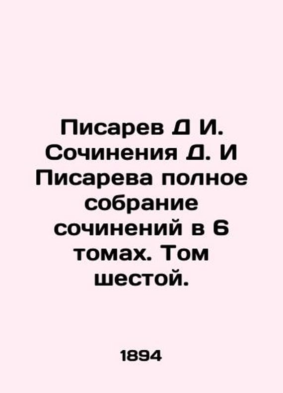Pisarev D. I. The Works of D. I. Pisarev is a complete collection of essays in 6 volumes. Volume Six. In Russian /Pisarev D I. Sochineniya D. I Pisareva polnoe sobranie sochineniy v 6 tomakh. Tom shestoy. Volume 6 of the authors portraits and an article about his literary activities are placed in Volume 6 of Pavlenkovs Editions. St. Petersburg Typography is the greatest affirmation of the Commodity of Fire in 1894. We have thousands of titles and often several copies of each title may be available. Please feel free to contact us for a detailed description of the copies available. The delivery of this book might be delayed beyond the usual timeframe due to extended processing and preparation before shipment, and faster shipping opSKUalb6476e647df9217b8