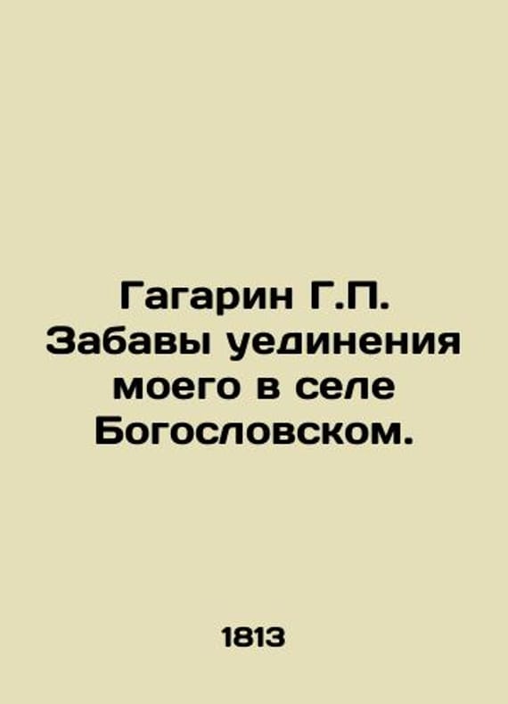 Gagarin G.P. The fun of my solitude in the village of Bogoslovsky. In Russian (ask us if in doubt)/Gagarin G.P. Zabavy uedineniya moego v sele Bogoslovskom. Short description: In Russian (ask us if in doubt).St. Petersburg. Type-I of the Military Ministry. 1813. 185s. We have thousands of titles and often several copies of each title may be available. Please feel free to contact us for a detailed description of the copies available. SKUalb653c67a3891e0f70