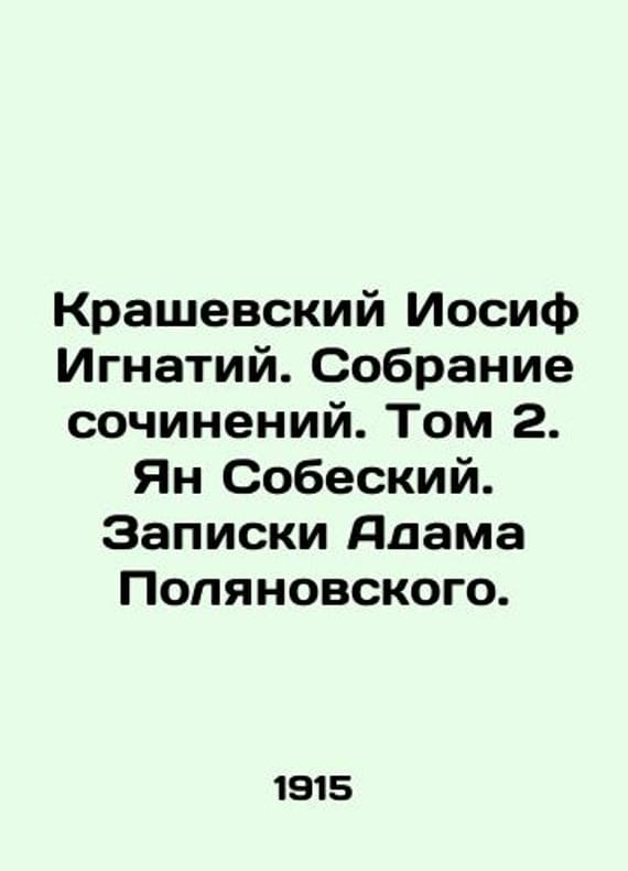 Kraszewski Joseph Ignatius. Collection of Works. Volume 2. Jan Sobieski. Notes by Adam Polyanovsky. In Russian /Krashevskiy Iosif Ignatiy. Sobranie sochineniy. Tom 2. Yan Sobeskiy. Zapiski Adama Polyanovskogo. A collection of works in twenty-six volumes. A free supplement to the journal Nature and People. Edited by I. Yasinsky (Maxim Belinsky). Petrograd. Publishing House by Soikin. 1915. We have thousands of titles and often several copies of each title may be available. Please feel free to contact us for a detailed description of the copies available. SKUalb655e93ee06fea9bf.