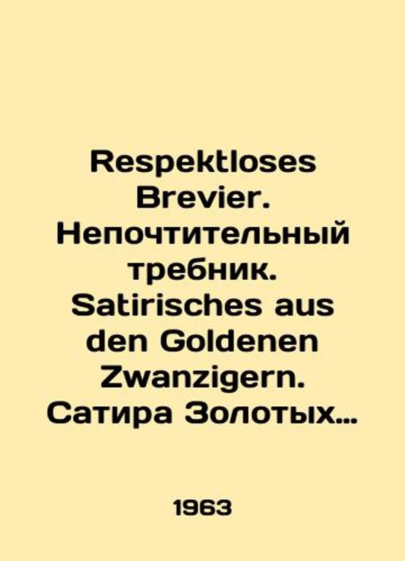 Respektloses Brevier. Irreverent trebnik. Satirisches aus den Goldenen Zwanzigern. Satire of the Golden Twenties In Russian /Respektloses Brevier. Nepochtitelnyy trebnik. Satirisches aus den Goldenen Zwanzigern. Satira Zolotykh dvadtsatykh Foreword by Karl Schnog. Compiled by Ursula Behs Eulenspiegel Verlag 1963. 185 p. We have thousands of titles and often several copies of each title may be available. Please feel free to contact us for a detailed description of the copies available. SKUalb660d3074850a5559.