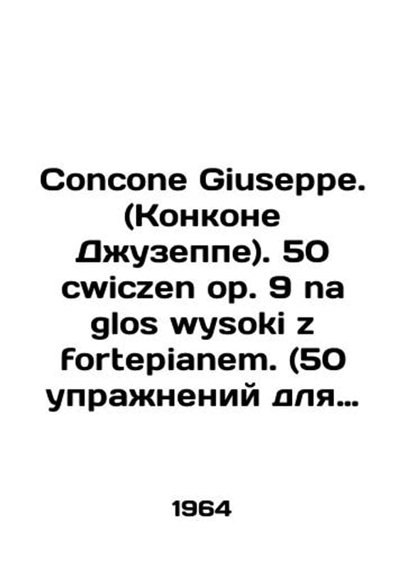 Concone Giuseppe. 50 cwiczen op. 9 na glos wysoki z fortepianem. (50 exercises for high voice accompanied by a piano). In Polish (ask us if in doubt)/Concone Giuseppe. (Konkone Dzhuzeppe). 50 cwiczen op. 9 na glos wysoki z fortepianem. (50 uprazhneniy dlya vysokogo golosa v soprovozhdenii fortepiano). Przejrzat Bronislaw Romaniszyn. In Polish. Krakow. WPM. Polskie Wydawnictwo Muzyczne. (Polish Music Publishing House). 1964. 96 p. We have thousands of titles and often several copies of each title may be available. Please feel free to contact us for a detailed description of the copies available. SKUalb662cf2c86beee6fb