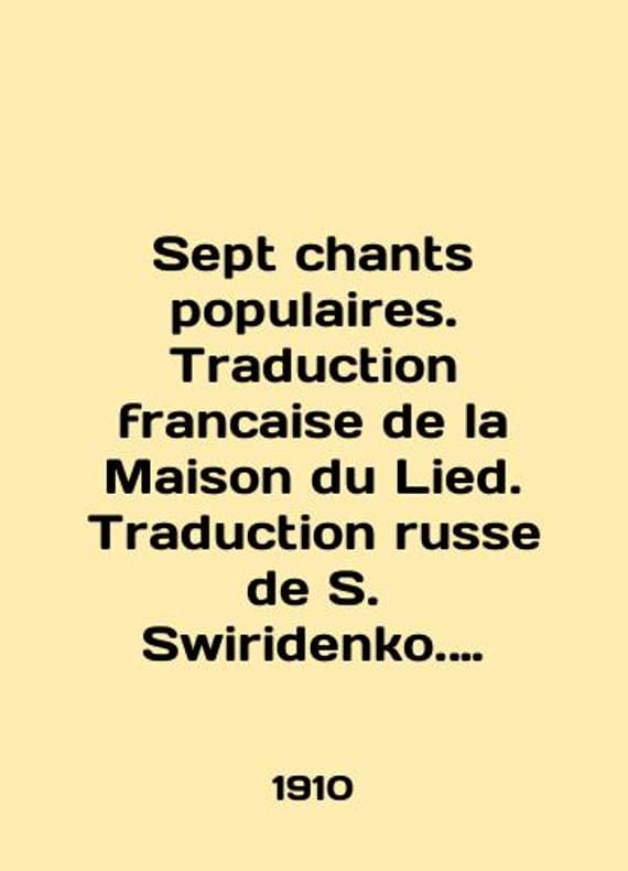 Sept chants populaires. Traduation francaise de la Maison du Lied. Traduation english de S. Swiridenko. Harmonisations de Maurice Ravel, Alexandre Georges, Alexandre Olenine. In English /Sept chants populaires. Traduction francaise de la Maison du Lied. Traduction russe de S. Swiridenko. Harmonisations de Maurice Ravel, Alexandre Georges, Alexandre Olenine. M.-Leipzig, Jurgenson. 1910. We have thousands of titles and often several copies of each title may be available. Please feel free to contact us for a detailed description of the copies available. SKUalb66484b025eab2684.