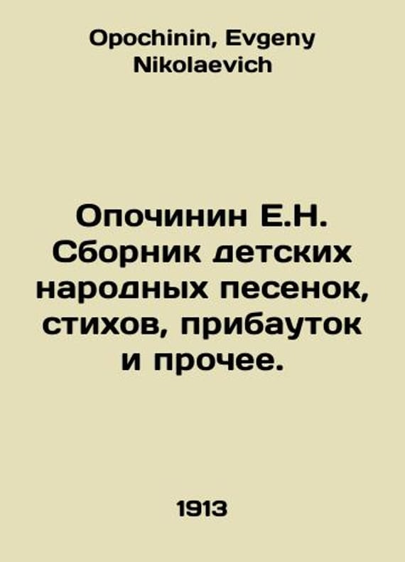 Opochinin E.N. A collection of childrens folk songs, poems, additions, etc. In Russian /Opochinin E.N. Sbornik detskikh narodnykh pesenok, stikhov, pribautok i prochee. Compiled with the addition of new entries by E. Opochinin. Moscow: Editions I. Knebel. 1913. 4,80,2, IIIc., p. We have thousands of titles and often several copies of each title may be available. Please feel free to contact us for a detailed description of the copies available. SKUalb6760273980e1cf8f.