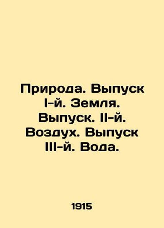 Nature. Issue I. Earth. Issue II. Air. Issue III. Water. In Russian /Priroda. Vypusk I-y. Zemlya. Vypusk. II-y. Vozdukh. Vypusk III-y. Voda. For the Pupils of Urban and Rural Primary Schools. M. Editions of the tv Zadrud. 1915. We have thousands of titles and often several copies of each title may be available. Please feel free to contact us for a detailed description of the copies available. SKUalb67bc75ecf3c4e4a7.