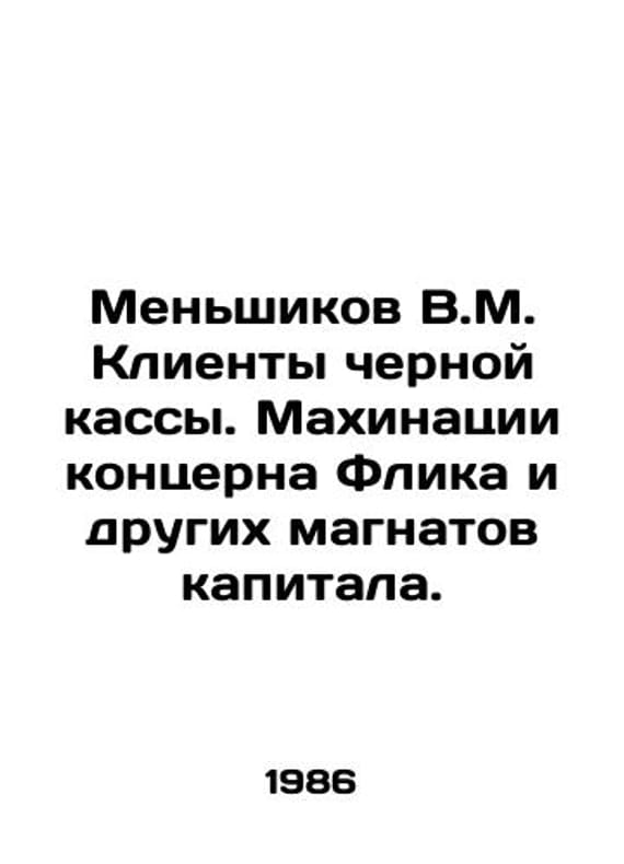 Menshikov V.M. Customers of the black box office. Machinations of Flick Concern and other capital tycoons. In Russian /Menshikov V.M. Klienty chernoy kassy. Makhinatsii kontserna Flika i drugikh magnatov kapitala. M Legal Literature 1986.We have thousands of titles and often several copies of each title may be available. Please feel free to contact us for a detailed description of the copies available. SKUalb67f0c79130bd20eb.