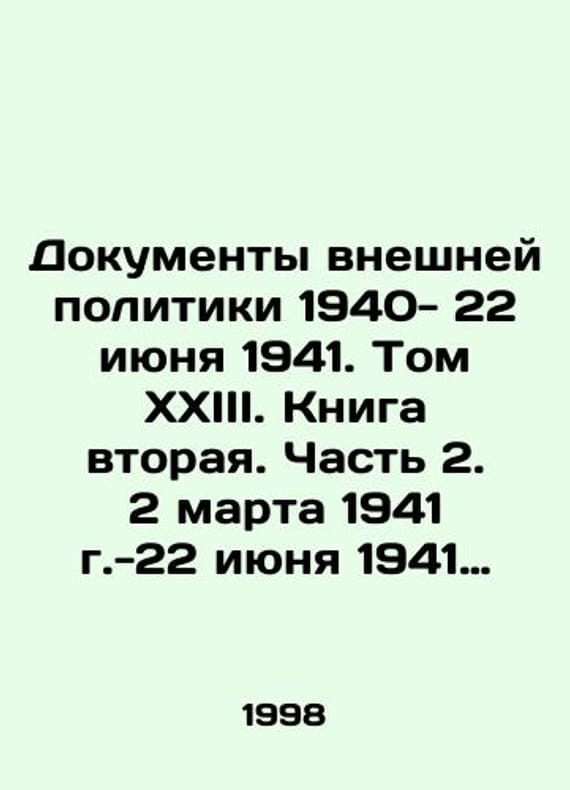 Foreign Policy Papers 1940-22 June 1941. Volume XXIII. Book Two. Part 2. March 2, 1941 -June 22, 1941. In Russian /Dokumenty vneshney politiki 1940- 22 iyunya 1941. Tom XXIII. Kniga vtoraya. Chast 2. 2 marta 1941 g.-22 iyunya 1941 g. M. International Relations 1998. 448 p. We have thousands of titles and often several copies of each title may be available. Please feel free to contact us for a detailed description of the copies available. SKUalb6bec32e30ac9a5d7.
