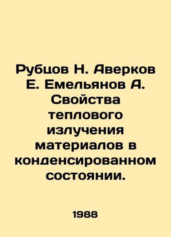 Rubtsov N. Averkov E. Yemelyanov A. Properties of thermal radiation of materials in a condensed state. In Russian /Rubtsov N. Averkov E. Emelyanov A. Svoystva teplovogo izlucheniya materialov v kondensirovannom sostoyanii. Novosibirsk Academy of Sciences of the USSR, 1988. 349c,. We have thousands of titles and often several copies of each title may be available. Please feel free to contact us for a detailed description of the copies available. SKUalb6cc9646e99b577d0.