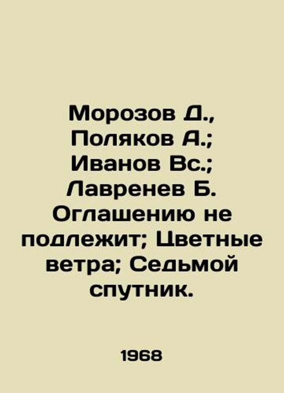 "Morozov D., Polyakov A.; Ivanov Sun.; Lavrenev B. Not subject to disclosure; Coloured winds; Seventh Sputnik. In Russian /Morozov D., Polyakov A.; Ivanov Vs.; Lavrenev B. Oglasheniyu ne podlezhit; Tsvetnye vetra; Sedmoy sputnik. Series of Feats, # 1 M The Young Guard 1968.We have thousands of titles and often several copies of each title may be available. Please feel free to contact us for a detailed description of the copies available. SKUalb6d1bb4ba45039b47."