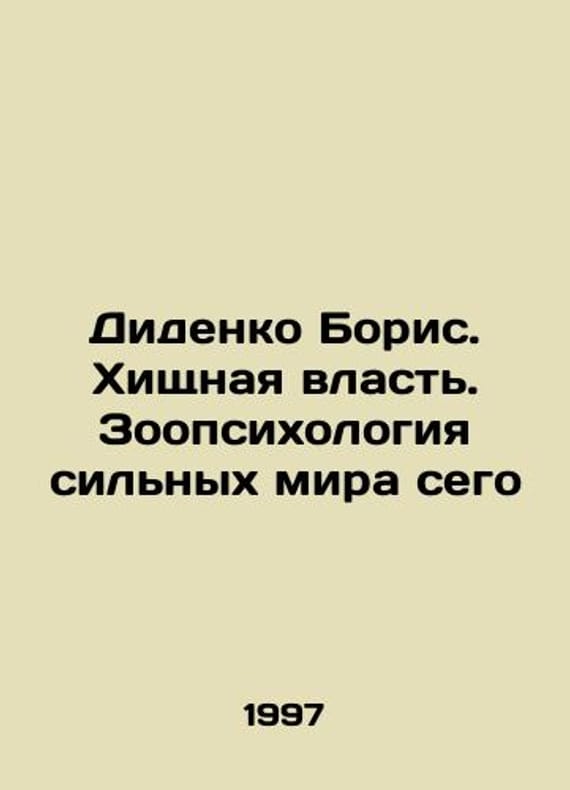 Didenko Boris. Predatory Power. Zoopsychology of the Powerful In Russian /Didenko Boris. Khishchnaya vlast. Zoopsikhologiya silnykh mira sego Circulation 1000. M. Publishing House Pomatur LLP 1997. These evil creatures bring cruelty, inhumanity, and shamelessness to our world. It is they who have been in power throughout history, forming a monstrous conglomerate of the powerful. We have thousands of titles and often several copies of each title may be available. Please feel free to contact us for a detailed description of the copies available. SKUalb6de46df72502f212.