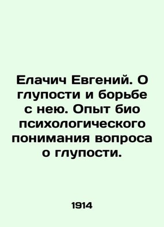 Yevgeny Yelacich. On stupidity and the struggle against it. Experience in bio-psychological understanding of stupidity. In Russian (ask us if in doubt)/Elachich Evgeniy. O gluposti i bor'be s neyu. Opyt bio psikhologicheskogo ponimaniya voprosa o gluposti. St. Petersburg. Author's Edition 1914. 138 p. We have thousands of titles and often several copies of each title may be available. Please feel free to contact us for a detailed description of the copies available. SKUalb715fa0aab204e78a