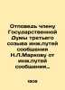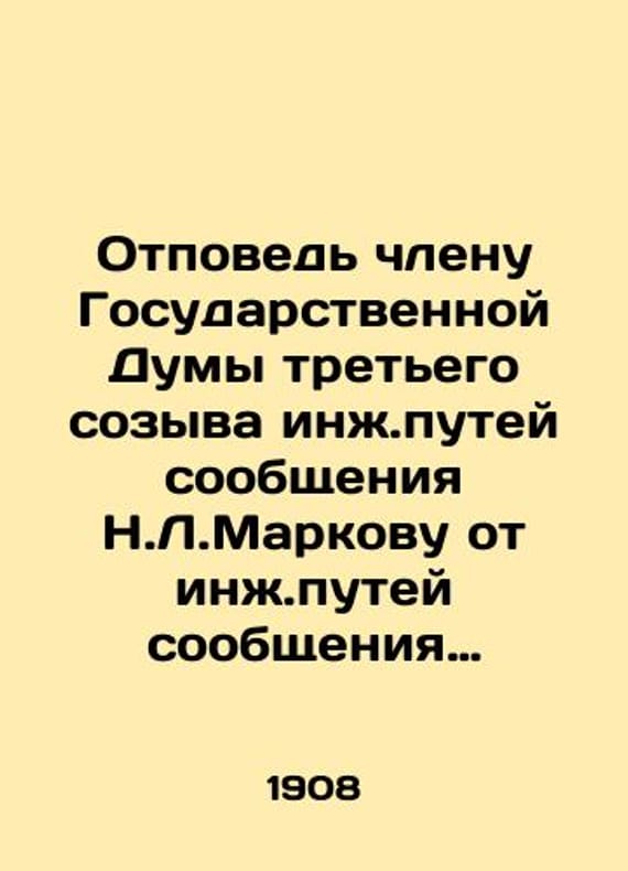 Reprieve to the member of the State Duma of the third convocation of the railways of communication, N.L.Markov, from the railways of communication, F.Enakiev. In Russian /Otpoved chlenu Gosudarstvennoy Dumy tretego sozyva inzh.putey soobshcheniya N.L.Markovu ot inzh.putey soobshcheniya F.Enakieva. On the question of the enterprise of Severo-Donetsk Railway. St. Petersburg Typo-Lithography by N. Yevstifiev, 1908, 53 p. We have thousands of titles and often several copies of each title may be available. Please feel free to contact us for a detailed description of the copies available. SKUalb71895e7818b3bf6e.