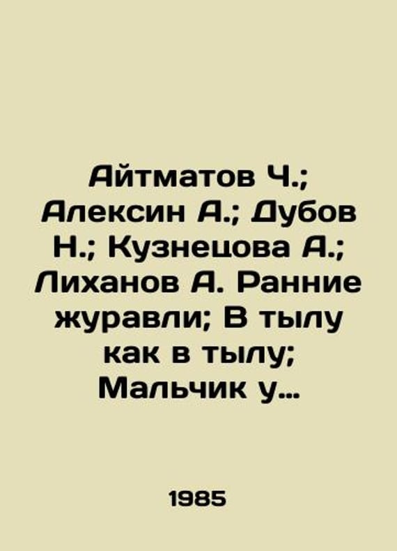 "Aitmatov Ch.; Aleksin A.; Dubov N.; Kuznetsova A.; Likhanov A. Early cranes; In the rear as in the rear; Boy by the sea; Earth bow; My General. In Russian /Aytmatov Ch.; Aleksin A.; Dubov N.; Kuznetsova A.; Likhanov A. Rannie zhuravli; V tylu kak v tylu; Malchik u morya; Zemnoy poklon; Moy general. Library of World Literature for Children, Volume 29, Book 1 M DL 1985.We have thousands of titles and often several copies of each title may be available. Please feel free to contact us for a detailed description of the copies available. SKUalb7393b6ba0773b155."
