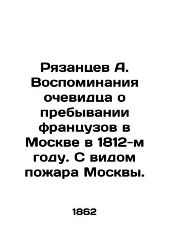 Ryazantsev A. Eyewitnesss memories of the French staying in Moscow in 1812 In Russian /Ryazantsev A. Vospominaniya ochevidtsa o prebyvanii frantsuzov v Moskve v 1812-m godu. S vidom pozhara Moskvy. M Type. M.P. Zakharova 1862. 1 l. We have thousands of titles and often several copies of each title may be available. Please feel free to contact us for a detailed description of the copies available. SKUalb74398581a50194c3.