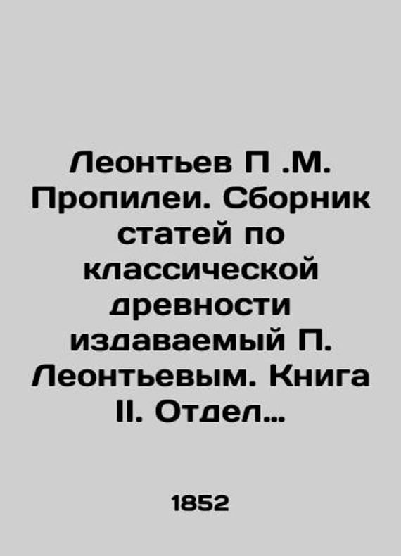 Leontyev P.M. Propilei. A collection of articles on classical antiquity published by P. Leontyev. Book II. Department one. Department two. /Leont'ev P.M. Propilei. Sbornik statey po klassicheskoy drevnosti izdavaemyy P. Leont'evym. Kniga II. Otdel pervyy. Otdel vtoroy. Moscow. University Printing House 1852. 4 256 p. We have thousands of titles and often several copies of each title may be available. Please feel free to contact us for a detailed description of the copies available. SKUalb770aa343d2945d20