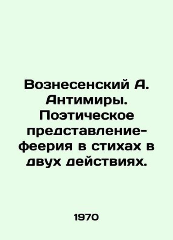 Short description: Voznesensky A. Antiworlds. Poetry-extravaganza in poetry in two acts. In Russian /Voznesenskiy A. Antimiry. Poeticheskoe predstavlenie-feeriya v stikhakh v dvukh deystviyakh.In Russian.Scenic variant of the Moscow Theatre of Drama and Comedy. Edited by E. Levin. Moscow. Department of Distribution of Dramatic Works of VUOAP. 1970. 62 p. We have thousands of titles and often several copies of each title may be available. Please feel free to contact us for a detailed description of the copies available. SKUalb77cf5238efa4498d
