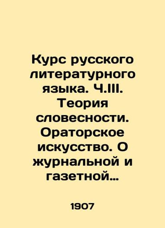 Course of the Russian Literary Language. Part III. Theory of Literature. Oratory Art. About magazine and newspaper work. In Russian /Kurs russkogo literaturnogo yazyka. Ch.III. Teoriya slovesnosti. Oratorskoe iskusstvo. O zhurnalnoy i gazetnoy rabote. St. Petersburg. Edition of the Vestnik of Knowledge 1907. We have thousands of titles and often several copies of each title may be available. Please feel free to contact us for a detailed description of the copies available. SKUalb789443c633219633.