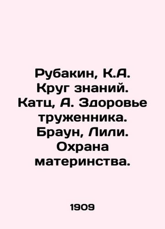 Short description: Rubakin, K.A. The Circle of Knowledge. Katz, A. Worker's Health. Brown, Lili. Maternity Protection. In Russian /Rubakin, K.A. Krug znaniy. Katts, A. Zdorov'e truzhennika. Braun, Lili. Okhrana materinstva.In Russian.Rubakin, K.A. The Circle of Knowledge. Katz, A. The Health of the Worker. Brown, Lili. Maternity Protection. St. Petersburg. From the Bulletin of Knowledge. Type-I of the First Labour Artel. 1909. 32 p.: 32 p.: 32 p., 20.0x14.0 cm. We have thousands of titles and often several copies of each title may be available. Please feel free to contact us for a detailed description of the copies available. SKUalb791de21b4fe934b4