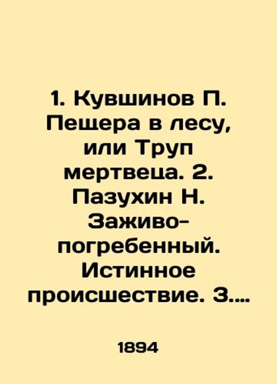 1. Pitchers P. The Cave in the Forest or the Corpse of a Dead Man. 2. Pazukhin N. Living and Buried. The True Accident. 3 In Russian (ask us if in doubt)/1. Kuvshinov P. Peshchera v lesu ili Trup mertvetsa. 2. Pazukhin N. Zazhivo-pogrebennyy. Istinnoe proisshestvie. 3. V Sv. Imenitye kuptsy Stroganovy i udaloy vityaz Sibirskiy knyaz. Moscow. Edition of the bookseller E.A. Gubanov. 1892 1894. 105. 108. 96 p. SKUalb7968a77240c392df.