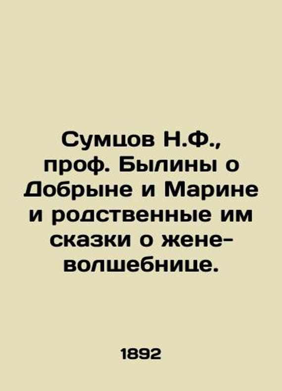 Sumtsov N.F. Prof. Bylina about Dobryn and Marina and related fairy tales about the wizard wife. In Russian (ask us if in doubt)/Sumtsov N.F. prof. Byliny o Dobryne i Marine i rodstvennye im skazki o zhene-volshebnitse.. Short description: In Russian (ask us if in doubt).A separate print from the Ethnographic Review books XIII-XIV) Moscow type. A. A. Levenson 1892. 27s. We have thousands of titles and often several copies of each title may be available. Please feel free to contact us for a detailed description of the copies available. SKUalb7b34482715dcced8