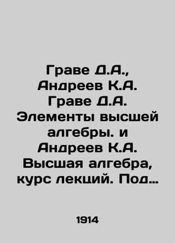 Grave D.A., Andreev K.A. Grave D.A. Elements of higher algebra and Andreev K.A. Higher algebra, course of lectures. Under one cover In Russian /Grave D.A., Andreev K.A. Grave D.A. Elementy vysshey algebry. i Andreev K.A. Vysshaya algebra, kurs lektsiy. Pod odnim perepletom K.-M. Publishing House of St. Vladimir Imperial University, 1914-1909. 696s. We have thousands of titles and often several copies of each title may be available. Please feel free to contact us for a detailed description of the copies available. SKUalb7b4dfe844ec96a26.