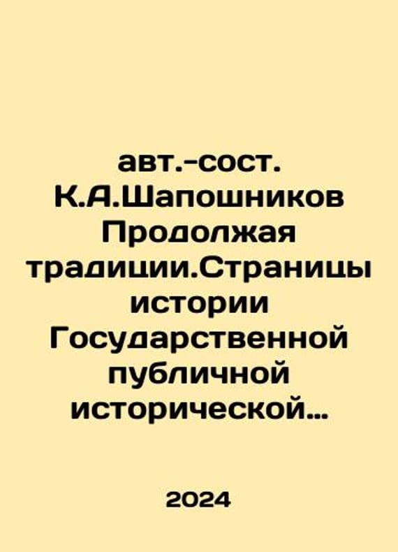 Short description: Author K.A. Shaposhnikov Continuing the tradition. Pages of history of the State Public Historical Library of Russia. To the 160th anniversary of Chertkovskaya Library and the 85th anniversary of the State Public Historical Library of Russia. In Russian /avt.-sost. K.A.Shaposhnikov Prodolzhaya traditsii.Stranitsy istorii Gosudarstvennoy publichnoy istoricheskoy biblioteki Rossii. K 160-letiyu Chertkovskoy biblioteki i 85-letiyu Gosudarstvennoy publichnoy istoricheskoy biblioteki Rossii.In Russian.2nd edition, amended and supplemented by Moscow State Publishing House and b-Bank of Russia, 2024, 92s. We have thousands of titles and often several copies of each title may be available. Please feel free to contact us for a detailed description of the copies available. SKUalb7ea37cd0575b3062