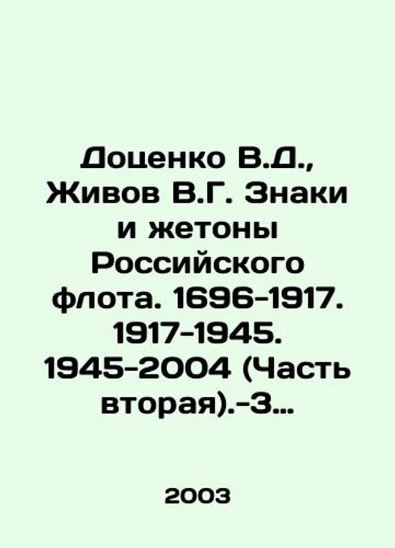Short description: Dotsenko V.D., Zhivov V.G. Signs and tokens of the Russian Fleet. 1696-1917. 1917-1945. 1945-2004 (Part Two) -3 volumes In Russian /Dotsenko V.D., Zhivov V.G. Znaki i zhetony Rossiyskogo flota. 1696-1917. 1917-1945. 1945-2004 (Chast' vtoraya).-3 tomaIn Russian.M. Polygon. 2003-2005. The books tell about the badges and tokens of the Russian fleet, which are presented at the celebration of the anniversaries of fleets, flotillas, naval bases: in honor of memorable events that took place in the history of underwater forces, at the graduation of naval educational institutions, etc. We have thousands of titles and often several copies of each title may be available. Please feel free to contact us for a detailed description of the copies available. SKUalb8028f9c244685c2e