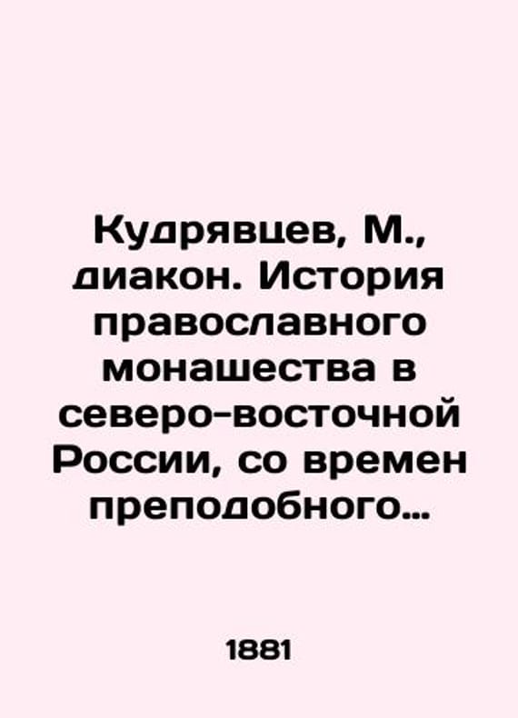 Kudryavtsev M. deacon. History of Orthodox monasticism in northeast Russia since the days of St. Sergius of Radonezh In Russian (ask us if in doubt)/Kudryavtsev M. diakon. Istoriya pravoslavnogo monashestva v severo-vostochnoy Rossii so vremen prepodobnogo Sergiya Radonezhskogo Short description: In Russian (ask us if in doubt).Part 1-2 Moscow M.N. Lavrov and Co. 1881 2 254 2 p. We have thousands of titles and often several copies of each title may be available. Please feel free to contact us for a detailed description of the copies available. SKUalb8048debfb0fbb8b2