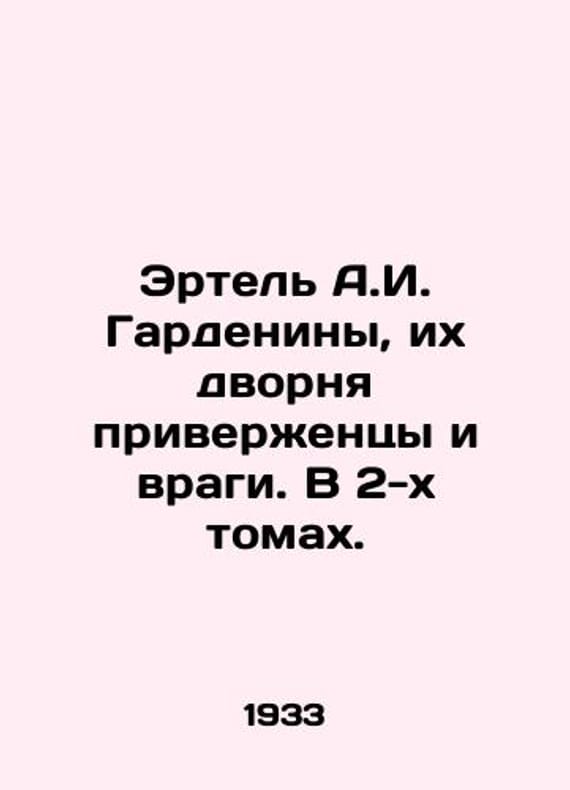 Short description: Ertel A.I. Gardenins, their palace adherents and enemies. In 2 volumes. In Russian /Ertel' A.I. Gardeniny, ikh dvornya priverzhentsy i vragi. V 2-kh tomakh.In Russian.Roman. Preparation of text, introduction, article and comments by A. Lezhnev. Illustration and design by E.D. Belukha. Academia, 1933, 536, 5 p. We have thousands of titles and often several copies of each title may be available. Please feel free to contact us for a detailed description of the copies available. SKUalb80fb276cdec3db56