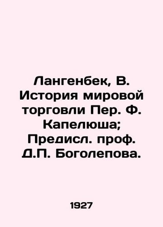 "Langenbeck, B. History of World Trade by Peter F. Kapelyusch; Present Prof. D.P. Bogolepova. In Russian /Langenbek, V. Istoriya mirovoy torgovli Per. F. Kapelyusha; Predisl. prof. D.P. Bogolepova. Economic Library. Moscow-Leningrad State Publishing House, 1927, 157, 1 p., 2 p., 24x16 sm. We have thousands of titles and often several copies of each title may be available. Please feel free to contact us for a detailed description of the copies available. SKUalb81271ee7e55dfbf6."