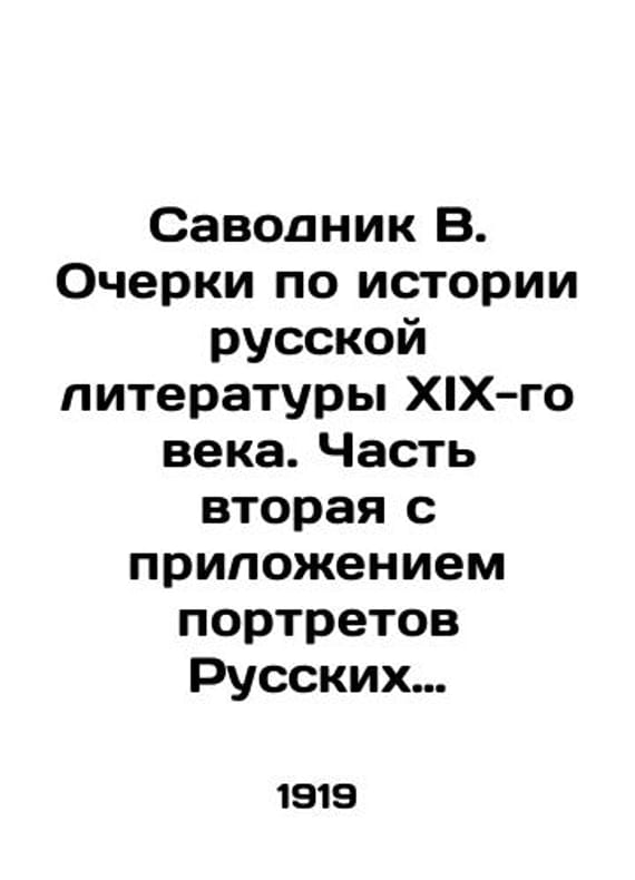 Savodnik V. Essays on the history of nineteenth-century Russian literature. Part two, with the attachment of portraits of Russian writers and synchronous tables. In Russian /Savodnik V. Ocherki po istorii russkoy literatury KhIKh-go veka. Chast vtoraya s prilozheniem portretov Russkikh pisateley i sinkhronicheskikh tablits. Edition 13. M.- Petrograd, V.V. Dumnov, 1919. We have thousands of titles and often several copies of each title may be available. Please feel free to contact us for a detailed description of the copies available. SKUalb813c0a4fca519e02.