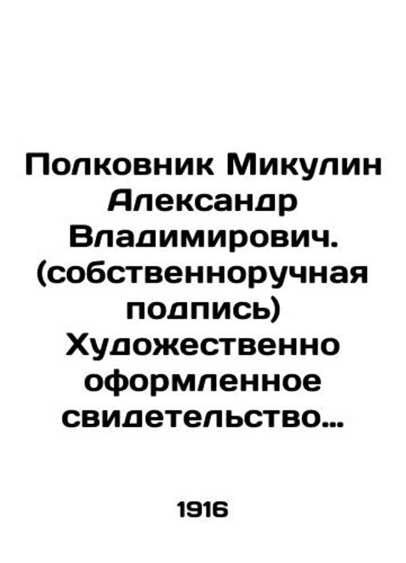 Colonel Alexander Vladimirovich Mikulin. (handwritten signature) An artistic certificate of completion of the course at the 15th March Battalion. In Russian (ask us if in doubt)/Polkovnik Mikulin Aleksandr Vladimirovich. (sobstvennoruchnaya podpis) Khudozhestvenno oformlennoe svidetelstvo ob okonchanii kursov pri 15-m marshevom batalone. With portraits of Tsar Nicholas II and Alexey Caesarevich with arms and banners. Odessa. Edition by E.I.Fesenko. 1916. 1 sheet. Lithography. 25.3x40 1 sm. We have thousands of titles and often several copies of each title may be available. Please feel free to contact us for a detailed description of the copies available. SKUalb829ba14d75411492